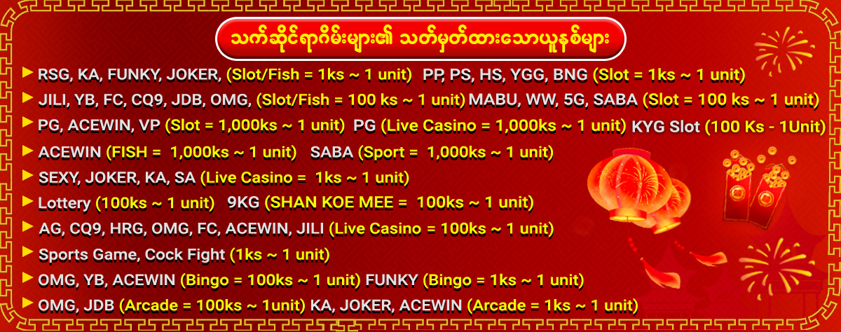 2. Slot ဂိမ္းအားလုံးတြက္ခ်က္ေပးပါသည္။(YGG ၊ ACE WIN မပါဝင္ပါ)အႏိုင္ရရွိေသာဆုမ်ားကို ႀကိမ္ေရတစ္ဆကစားၿပီးမွသာလွ်င္ေငြထုတ္ႏိုင္မည္။